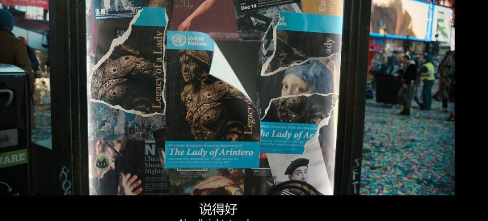 1.女主被射杀了。 但如果要拍续集(个人感觉这部电影还是值得拍下去的),那得解释下房间里枪声是怎么来的。 2.真雕像被炸掉了。 曾经想过: a.会不会富翁家那座雕像,只有那颗掉落的宝石是假的,其余是真的;后来想想这样就过于神剧化了,拍续集的话,雕像作用也不大,所以这个设想是不成立的。 b.会不会结尾时代广场出现的雕像展出海报,是真雕像找回来了,然后做的展览?但放大看了看,上面写着展出日期是从圣诞节到1月1日(下图)——拖着雕像雪地追击的时候已经是圣诞节了,小镇的布置就说明了这个时间,所以即便能找回来真雕像,也来不及组织从圣诞节开始的展览,所以这个海报应该是旧的,说明不了啥问题。