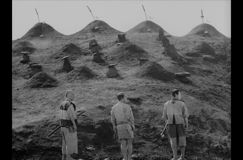 第二位武士五郎兵卫死了。山贼还没杀完,剩十三骑。 这些武士,都是至情至义之人啊。 决战前夜真的很好看啊,无论镜头转到哪里。正如菊千代所言,农民其实什么都有,最后一战的前夕,武士被农民赠予美酒。 “农民女儿与武士怎可结合?”“他们真心相爱,怕什么,又不是与山贼通奸” 志乃的父亲万造那一张横亘着矛盾的脸啊…… 之后竟然下起大雨,雨中只剩胜四郎和志乃还有隐隐的火堆…… 泥泞、马蹄、箭矢、尸体,落雨不停。 最后一把火铳杀死了两位武士,久藏和菊千代,最勇毅的两位。久藏中弹后临死也要掷出刀刃,那一瞬间武士的形象完满了。放浪形骸的菊千代重伤后依然一击制敌,好为这样一位性情之武士感到惋惜。 岛田勘兵卫对七郎说:“我们又活下来了。”旁边是跪地的胜四郎在为他的英雄们痛哭。我认为在此时,菊千代早就也成为了这个年轻武士的英雄。 瓢泼中,七武士的旗帜在屋顶飞舞,是一场惨胜。 山贼歼灭后,天就放晴了。农民重整农务,周而复始,好像一切都没发生过一样。不过,倘若以时间为坐标,这座村子,绝不只是多了山丘上的四座武士冢和其他坟茔。